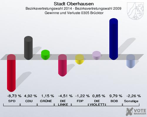 Stadt Oberhausen, Bezirksvertretungswahl 2014 - Bezirksvertretungswahl 2009,  Gewinne und Verluste 0305 Brücktor: SPD: -8,73 %. CDU: 4,92 %. GRÜNE: 1,15 %. DIE LINKE: -4,51 %. FDP: -1,22 %. DIE VIOLETTEN: 0,85 %. BOB: 9,79 %. Sonstige: -2,26 %. http://www.votemanager.de