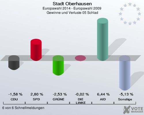 Stadt Oberhausen, Europawahl 2014 - Europawahl 2009,  Gewinne und Verluste 05 Schlad: CDU: -1,58 %. SPD: 2,80 %. GRÜNE: -2,53 %. DIE LINKE: -0,02 %. AfD: 6,44 %. Sonstige: -5,13 %. 6 von 6 Schnellmeldungen http://www.votemanager.de