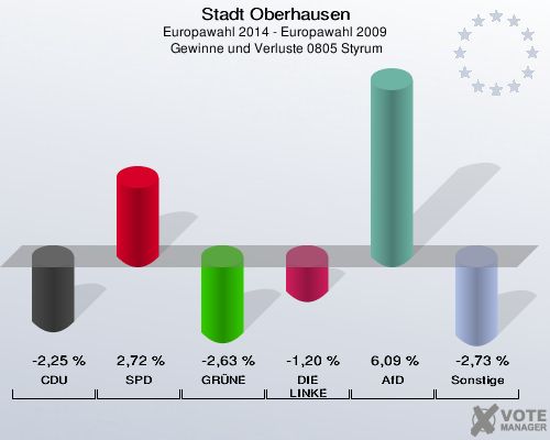 Stadt Oberhausen, Europawahl 2014 - Europawahl 2009,  Gewinne und Verluste 0805 Styrum: CDU: -2,25 %. SPD: 2,72 %. GRÜNE: -2,63 %. DIE LINKE: -1,20 %. AfD: 6,09 %. Sonstige: -2,73 %. http://www.votemanager.de