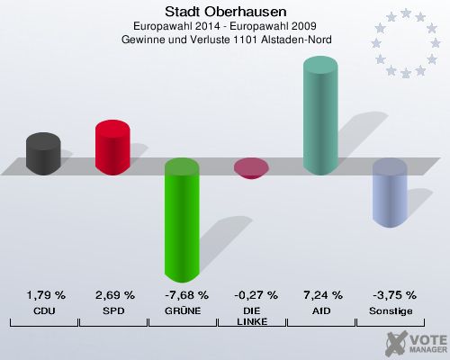 Stadt Oberhausen, Europawahl 2014 - Europawahl 2009,  Gewinne und Verluste 1101 Alstaden-Nord: CDU: 1,79 %. SPD: 2,69 %. GRÜNE: -7,68 %. DIE LINKE: -0,27 %. AfD: 7,24 %. Sonstige: -3,75 %. http://www.votemanager.de