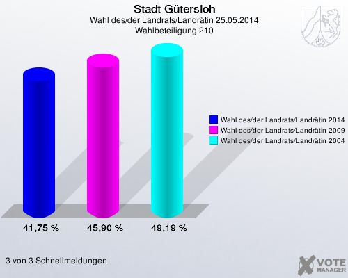 Stadt Gütersloh, Wahl des/der Landrats/Landrätin 25.05.2014, Wahlbeteiligung 210: Wahl des/der Landrats/Landrätin 2014: 41,75 %. Wahl des/der Landrats/Landrätin 2009: 45,90 %. Wahl des/der Landrats/Landrätin 2004: 49,19 %. 3 von 3 Schnellmeldungen http://www.votemanager.de