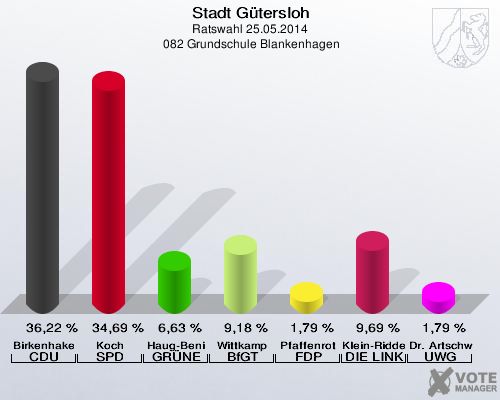 Stadt Gütersloh, Ratswahl 25.05.2014,  082 Grundschule Blankenhagen: Birkenhake CDU: 36,22 %. Koch SPD: 34,69 %. Haug-Benien GRÜNE: 6,63 %. Wittkamp BfGT: 9,18 %. Pfaffenrot FDP: 1,79 %. Klein-Ridder DIE LINKE: 9,69 %. Dr. Artschwager-Perl UWG: 1,79 %. http://www.votemanager.de