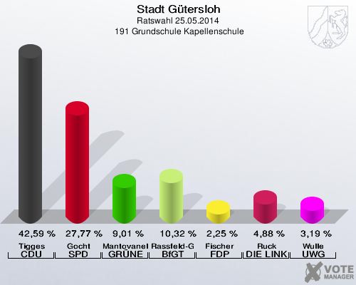 Stadt Gütersloh, Ratswahl 25.05.2014,  191 Grundschule Kapellenschule: Tigges CDU: 42,59 %. Gocht SPD: 27,77 %. Mantovanelli GRÜNE: 9,01 %. Rassfeld-Geib BfGT: 10,32 %. Fischer FDP: 2,25 %. Ruck DIE LINKE: 4,88 %. Wulle UWG: 3,19 %. http://www.votemanager.de