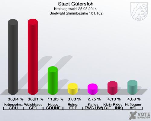 Stadt Gütersloh, Kreistagswahl 25.05.2014,  Briefwahl Stimmbezirke 101/102: Krümpelmann CDU: 36,64 %. Weichhaus SPD: 36,91 %. Hesse GRÜNE: 11,85 %. Reiner FDP: 3,03 %. Kalley FWG-UWG: 2,75 %. Klein-Ridder DIE LINKE: 4,13 %. Nußbaum AfD: 4,68 %. http://www.votemanager.de