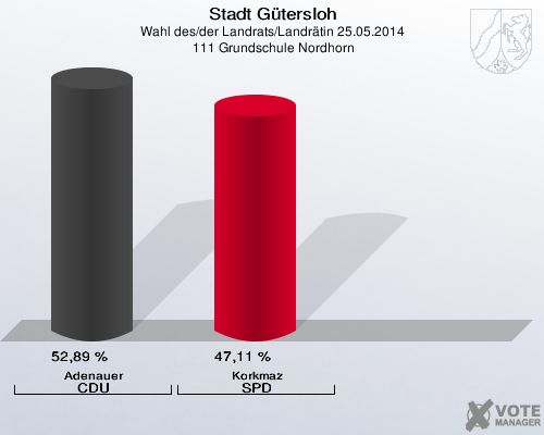 Stadt Gütersloh, Wahl des/der Landrats/Landrätin 25.05.2014,  111 Grundschule Nordhorn: Adenauer CDU: 52,89 %. Korkmaz SPD: 47,11 %. http://www.votemanager.de