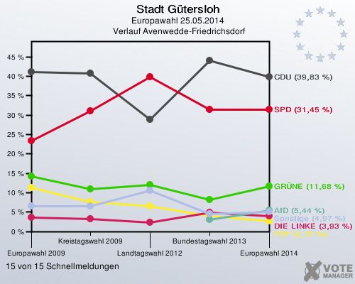 Stadt Gütersloh, Europawahl 25.05.2014,  Verlauf Avenwedde-Friedrichsdorf: 15 von 15 Schnellmeldungen http://www.votemanager.de