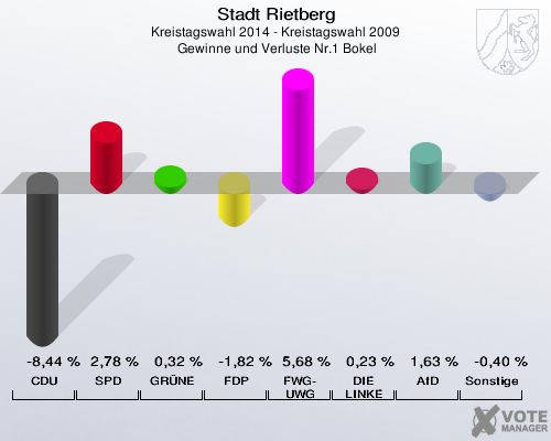 Stadt Rietberg, Kreistagswahl 2014 - Kreistagswahl 2009,  Gewinne und Verluste Nr.1 Bokel: CDU: -8,44 %. SPD: 2,78 %. GRÜNE: 0,32 %. FDP: -1,82 %. FWG-UWG: 5,68 %. DIE LINKE: 0,23 %. AfD: 1,63 %. Sonstige: -0,40 %. http://www.votemanager.de