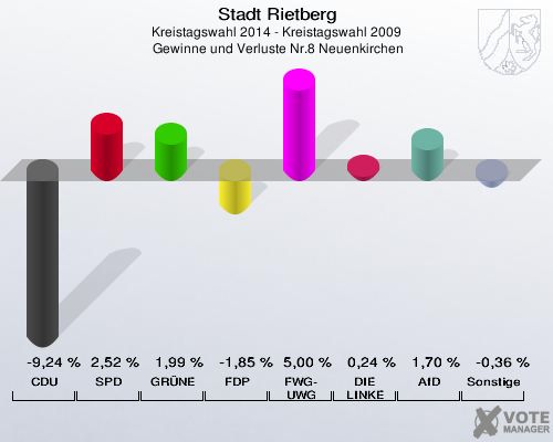 Stadt Rietberg, Kreistagswahl 2014 - Kreistagswahl 2009,  Gewinne und Verluste Nr.8 Neuenkirchen: CDU: -9,24 %. SPD: 2,52 %. GRÜNE: 1,99 %. FDP: -1,85 %. FWG-UWG: 5,00 %. DIE LINKE: 0,24 %. AfD: 1,70 %. Sonstige: -0,36 %. http://www.votemanager.de