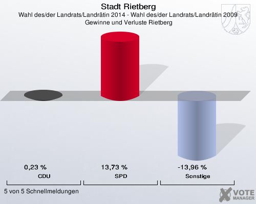 Stadt Rietberg, Wahl des/der Landrats/Landrätin 2014 - Wahl des/der Landrats/Landrätin 2009,  Gewinne und Verluste Rietberg: CDU: 0,23 %. SPD: 13,73 %. Sonstige: -13,96 %. 5 von 5 Schnellmeldungen http://www.votemanager.de