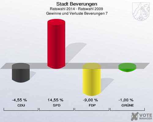 Stadt Beverungen, Ratswahl 2014 - Ratswahl 2009,  Gewinne und Verluste Beverungen 7: CDU: -4,55 %. SPD: 14,55 %. FDP: -9,00 %. GRÜNE: -1,00 %. http://www.votemanager.de