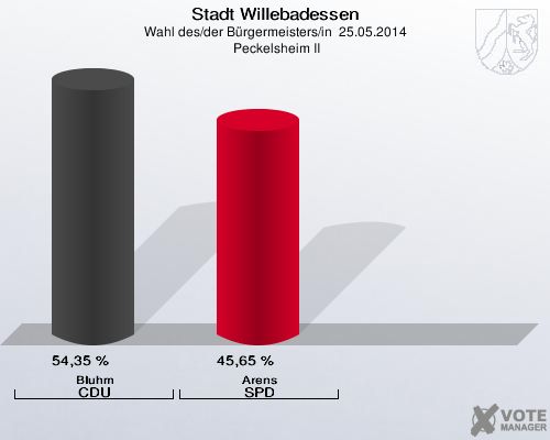Stadt Willebadessen, Wahl des/der Bürgermeisters/in  25.05.2014,  Peckelsheim II: Bluhm CDU: 54,35 %. Arens SPD: 45,65 %. http://www.votemanager.de