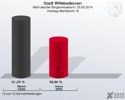 Stadt Willebadessen, Wahl des/der Bürgermeisters/in  25.05.2014,  Kreistag Wahlbezirk 18: Bluhm CDU: 61,20 %. Arens SPD: 38,80 %. 13 von 13 Schnellmeldungen http://www.votemanager.de