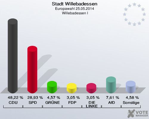 Stadt Willebadessen, Europawahl 25.05.2014,  Willebadessen I: CDU: 48,22 %. SPD: 28,93 %. GRÜNE: 4,57 %. FDP: 3,05 %. DIE LINKE: 3,05 %. AfD: 7,61 %. Sonstige: 4,58 %. http://www.votemanager.de