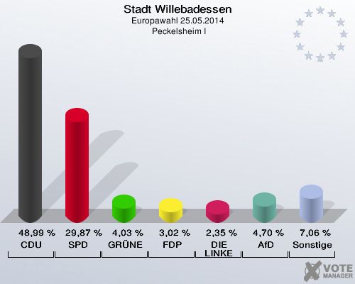 Stadt Willebadessen, Europawahl 25.05.2014,  Peckelsheim I: CDU: 48,99 %. SPD: 29,87 %. GRÜNE: 4,03 %. FDP: 3,02 %. DIE LINKE: 2,35 %. AfD: 4,70 %. Sonstige: 7,06 %. http://www.votemanager.de