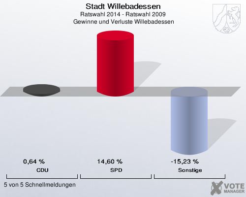 Stadt Willebadessen, Ratswahl 2014 - Ratswahl 2009,  Gewinne und Verluste Willebadessen: CDU: 0,64 %. SPD: 14,60 %. Sonstige: -15,23 %. 5 von 5 Schnellmeldungen http://www.votemanager.de
