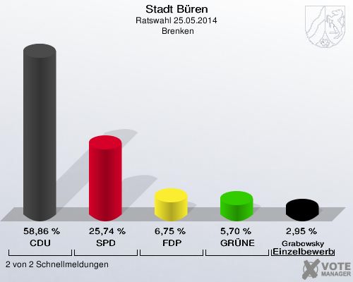 Stadt Büren, Ratswahl 25.05.2014,  Brenken: CDU: 58,86 %. SPD: 25,74 %. FDP: 6,75 %. GRÜNE: 5,70 %. Grabowsky Einzelbewerber: 2,95 %. 2 von 2 Schnellmeldungen http://www.votemanager.de