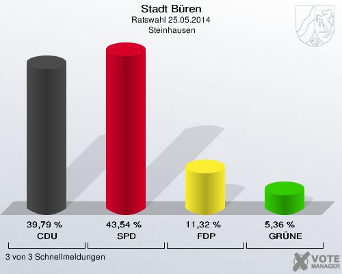 Stadt Büren, Ratswahl 25.05.2014,  Steinhausen: CDU: 39,79 %. SPD: 43,54 %. FDP: 11,32 %. GRÜNE: 5,36 %. 3 von 3 Schnellmeldungen http://www.votemanager.de