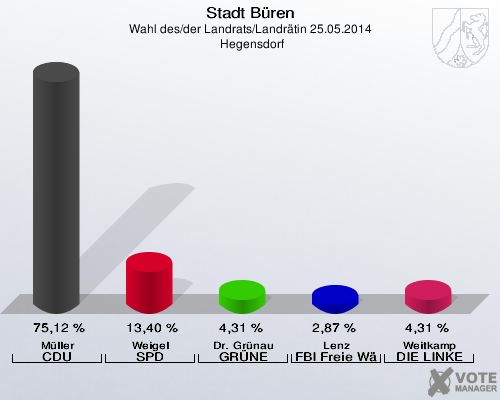 Stadt Büren, Wahl des/der Landrats/Landrätin 25.05.2014,  Hegensdorf: Müller CDU: 75,12 %. Weigel SPD: 13,40 %. Dr. Grünau GRÜNE: 4,31 %. Lenz FBI Freie Wähler: 2,87 %. Weitkamp DIE LINKE: 4,31 %. http://www.votemanager.de