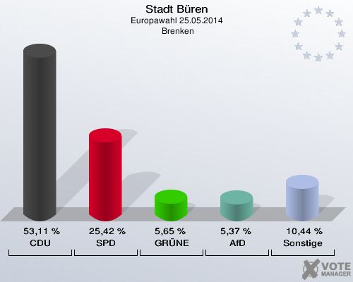 Stadt Büren, Europawahl 25.05.2014,  Brenken: CDU: 53,11 %. SPD: 25,42 %. GRÜNE: 5,65 %. AfD: 5,37 %. Sonstige: 10,44 %. http://www.votemanager.de