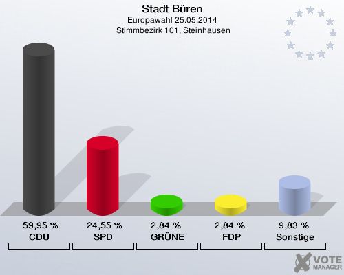 Stadt Büren, Europawahl 25.05.2014,  Stimmbezirk 101, Steinhausen: CDU: 59,95 %. SPD: 24,55 %. GRÜNE: 2,84 %. FDP: 2,84 %. Sonstige: 9,83 %. http://www.votemanager.de