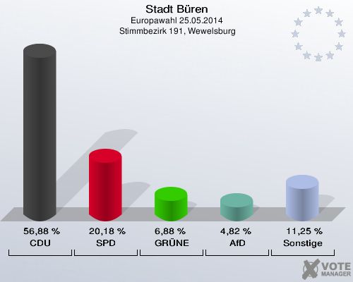 Stadt Büren, Europawahl 25.05.2014,  Stimmbezirk 191, Wewelsburg: CDU: 56,88 %. SPD: 20,18 %. GRÜNE: 6,88 %. AfD: 4,82 %. Sonstige: 11,25 %. http://www.votemanager.de