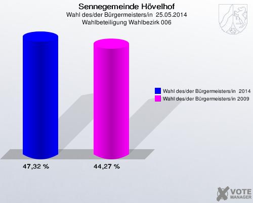 Sennegemeinde Hövelhof, Wahl des/der Bürgermeisters/in  25.05.2014, Wahlbeteiligung Wahlbezirk 006: Wahl des/der Bürgermeisters/in  2014: 47,32 %. Wahl des/der Bürgermeisters/in 2009: 44,27 %. http://www.votemanager.de