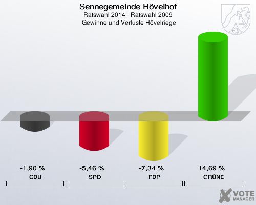 Sennegemeinde Hövelhof, Ratswahl 2014 - Ratswahl 2009,  Gewinne und Verluste Hövelriege: CDU: -1,90 %. SPD: -5,46 %. FDP: -7,34 %. GRÜNE: 14,69 %. http://www.votemanager.de