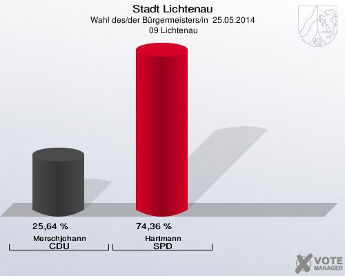 Stadt Lichtenau, Wahl des/der Bürgermeisters/in  25.05.2014,  09 Lichtenau: Merschjohann CDU: 25,64 %. Hartmann SPD: 74,36 %. http://www.votemanager.de