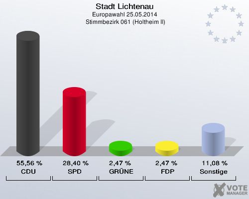 Stadt Lichtenau, Europawahl 25.05.2014,  Stimmbezirk 061 (Holtheim II): CDU: 55,56 %. SPD: 28,40 %. GRÜNE: 2,47 %. FDP: 2,47 %. Sonstige: 11,08 %. http://www.votemanager.de
