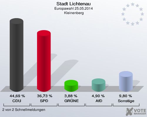 Stadt Lichtenau, Europawahl 25.05.2014,  Kleinenberg: CDU: 44,69 %. SPD: 36,73 %. GRÜNE: 3,88 %. AfD: 4,90 %. Sonstige: 9,80 %. 2 von 2 Schnellmeldungen http://www.votemanager.de