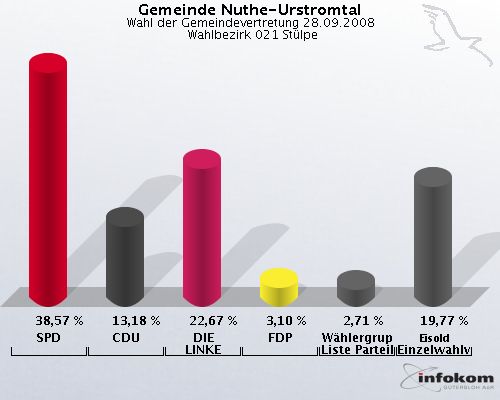 Gemeinde Nuthe-Urstromtal, Wahl der Gemeindevertretung 28.09.2008,  Wahlbezirk 021 Stülpe: SPD: 38,57 %. CDU: 13,18 %. DIE LINKE: 22,67 %. FDP: 3,10 %. Wählergruppe Freie Liste Parteilos: 2,71 %. Eisold Einzelwahlvorschlag Eisold: 19,77 %. http://www.infokom-gt.de