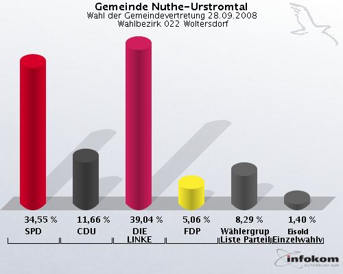 Gemeinde Nuthe-Urstromtal, Wahl der Gemeindevertretung 28.09.2008,  Wahlbezirk 022 Woltersdorf: SPD: 34,55 %. CDU: 11,66 %. DIE LINKE: 39,04 %. FDP: 5,06 %. Wählergruppe Freie Liste Parteilos: 8,29 %. Eisold Einzelwahlvorschlag Eisold: 1,40 %. http://www.infokom-gt.de