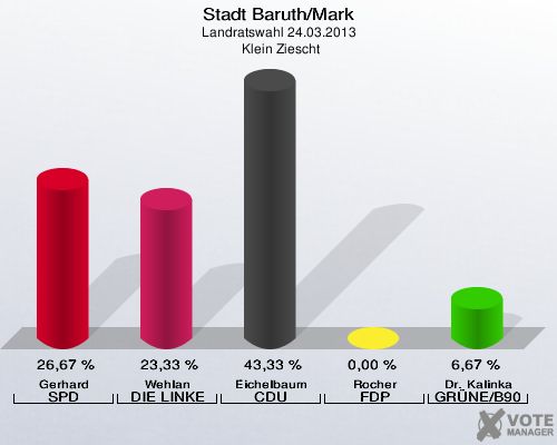 Stadt Baruth/Mark, Landratswahl 24.03.2013,  Klein Ziescht: Gerhard SPD: 26,67 %. Wehlan DIE LINKE: 23,33 %. Eichelbaum CDU: 43,33 %. Rocher FDP: 0,00 %. Dr. Kalinka GRÜNE/B90: 6,67 %. http://www.votemanager.de