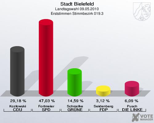 Stadt Bielefeld, Landtagswahl 09.05.2010, Erststimmen Stimmbezirk 019.3: Kozlowski CDU: 29,18 %. Fortmeier SPD: 47,03 %. Schmolke GRÜNE: 14,59 %. Seidenberg FDP: 3,12 %. Pusch DIE LINKE: 6,09 %. http://www.votemanager.de