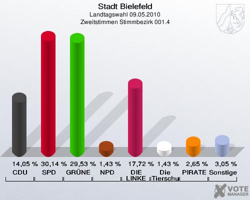 Stadt Bielefeld, Landtagswahl 09.05.2010, Zweitstimmen Stimmbezirk 001.4: CDU: 14,05 %. SPD: 30,14 %. GRÜNE: 29,53 %. NPD: 1,43 %. DIE LINKE: 17,72 %. Die Tierschutzpartei: 1,43 %. PIRATEN: 2,65 %. Sonstige: 3,05 %. http://www.votemanager.de