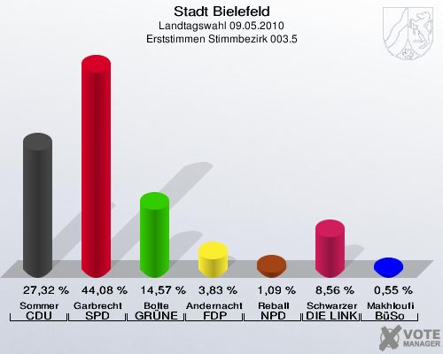 Stadt Bielefeld, Landtagswahl 09.05.2010, Erststimmen Stimmbezirk 003.5: Sommer CDU: 27,32 %. Garbrecht SPD: 44,08 %. Bolte GRÜNE: 14,57 %. Andernacht FDP: 3,83 %. Reball NPD: 1,09 %. Schwarzer DIE LINKE: 8,56 %. Makhloufi BüSo: 0,55 %. http://www.votemanager.de