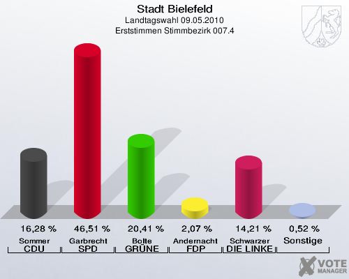 Stadt Bielefeld, Landtagswahl 09.05.2010, Erststimmen Stimmbezirk 007.4: Sommer CDU: 16,28 %. Garbrecht SPD: 46,51 %. Bolte GRÜNE: 20,41 %. Andernacht FDP: 2,07 %. Schwarzer DIE LINKE: 14,21 %. Sonstige: 0,52 %. http://www.votemanager.de