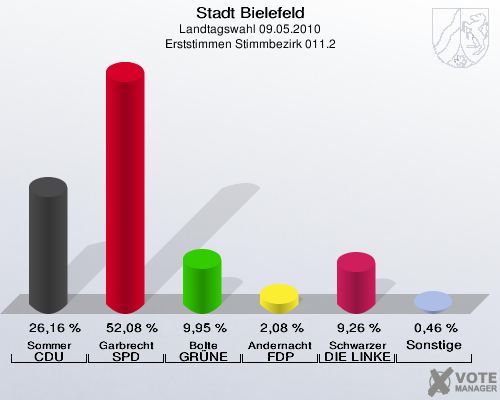 Stadt Bielefeld, Landtagswahl 09.05.2010, Erststimmen Stimmbezirk 011.2: Sommer CDU: 26,16 %. Garbrecht SPD: 52,08 %. Bolte GRÜNE: 9,95 %. Andernacht FDP: 2,08 %. Schwarzer DIE LINKE: 9,26 %. Sonstige: 0,46 %. http://www.votemanager.de
