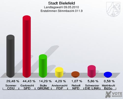 Stadt Bielefeld, Landtagswahl 09.05.2010, Erststimmen Stimmbezirk 011.9: Sommer CDU: 29,48 %. Garbrecht SPD: 44,43 %. Bolte GRÜNE: 14,29 %. Andernacht FDP: 4,29 %. Reball NPD: 1,07 %. Schwarzer DIE LINKE: 5,86 %. Makhloufi BüSo: 0,58 %. http://www.votemanager.de