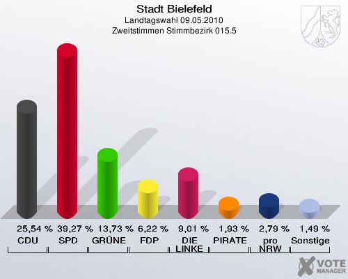 Stadt Bielefeld, Landtagswahl 09.05.2010, Zweitstimmen Stimmbezirk 015.5: CDU: 25,54 %. SPD: 39,27 %. GRÜNE: 13,73 %. FDP: 6,22 %. DIE LINKE: 9,01 %. PIRATEN: 1,93 %. pro NRW: 2,79 %. Sonstige: 1,49 %. http://www.votemanager.de