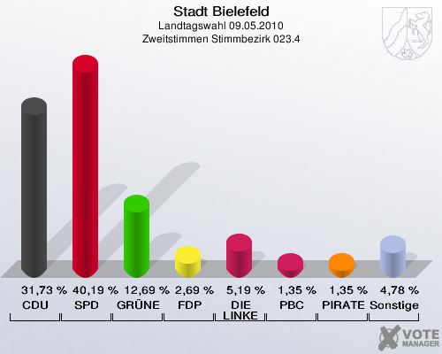 Stadt Bielefeld, Landtagswahl 09.05.2010, Zweitstimmen Stimmbezirk 023.4: CDU: 31,73 %. SPD: 40,19 %. GRÜNE: 12,69 %. FDP: 2,69 %. DIE LINKE: 5,19 %. PBC: 1,35 %. PIRATEN: 1,35 %. Sonstige: 4,78 %. http://www.votemanager.de