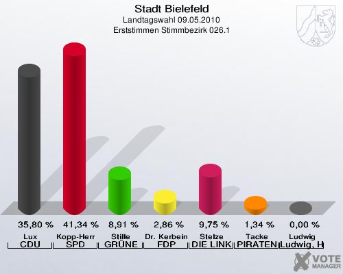 Stadt Bielefeld, Landtagswahl 09.05.2010, Erststimmen Stimmbezirk 026.1: Lux CDU: 35,80 %. Kopp-Herr SPD: 41,34 %. Stille GRÜNE: 8,91 %. Dr. Kerbein FDP: 2,86 %. Stelze DIE LINKE: 9,75 %. Tacke PIRATEN: 1,34 %. Ludwig Ludwig, Hans-Joachim: 0,00 %. http://www.votemanager.de