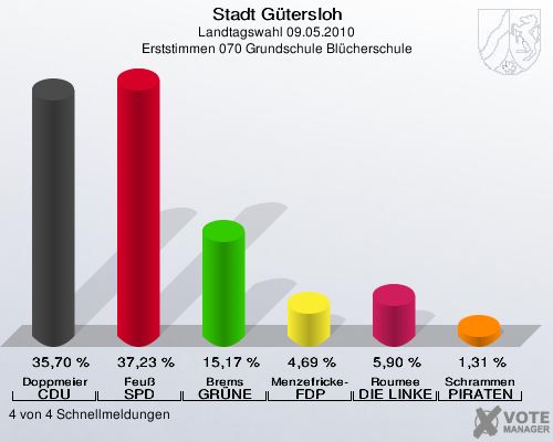 Stadt Gütersloh, Landtagswahl 09.05.2010, Erststimmen 070 Grundschule Blücherschule: Doppmeier CDU: 35,70 %. Feuß SPD: 37,23 %. Brems GRÜNE: 15,17 %. Menzefricke-Koitz FDP: 4,69 %. Roumee DIE LINKE: 5,90 %. Schrammen PIRATEN: 1,31 %. 4 von 4 Schnellmeldungen http://www.votemanager.de