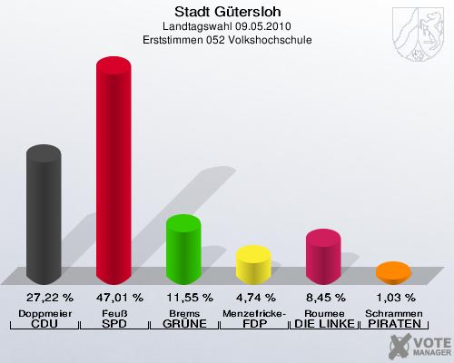 Stadt Gütersloh, Landtagswahl 09.05.2010, Erststimmen 052 Volkshochschule: Doppmeier CDU: 27,22 %. Feuß SPD: 47,01 %. Brems GRÜNE: 11,55 %. Menzefricke-Koitz FDP: 4,74 %. Roumee DIE LINKE: 8,45 %. Schrammen PIRATEN: 1,03 %. http://www.votemanager.de