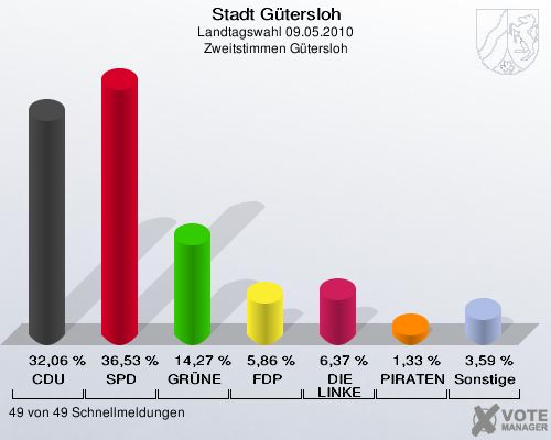 Stadt Gütersloh, Landtagswahl 09.05.2010, Zweitstimmen Gütersloh: CDU: 32,06 %. SPD: 36,53 %. GRÜNE: 14,27 %. FDP: 5,86 %. DIE LINKE: 6,37 %. PIRATEN: 1,33 %. Sonstige: 3,59 %. 49 von 49 Schnellmeldungen http://www.votemanager.de