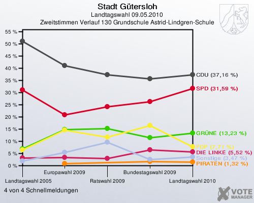 Stadt Gütersloh, Landtagswahl 09.05.2010, Zweitstimmen Verlauf 130 Grundschule Astrid-Lindgren-Schule: 4 von 4 Schnellmeldungen http://www.votemanager.de
