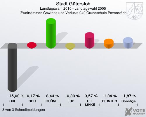 Stadt Gütersloh, Landtagswahl 2010 - Landtagswahl 2005, Zweitstimmen Gewinne und Verluste 040 Grundschule Pavenstädt: CDU: -15,00 %. SPD: 0,17 %. GRÜNE: 8,44 %. FDP: -0,39 %. DIE LINKE: 3,57 %. PIRATEN: 1,34 %. Sonstige: 1,87 %. 3 von 3 Schnellmeldungen http://www.votemanager.de