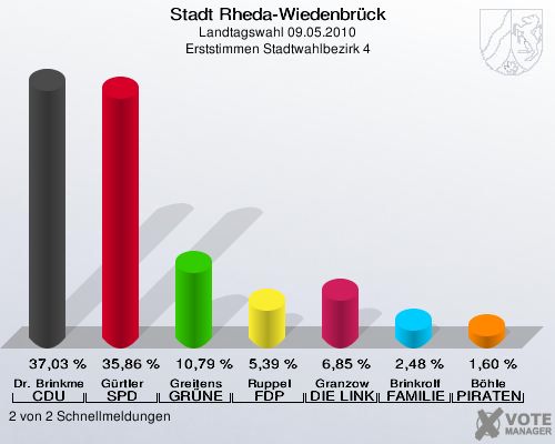 Stadt Rheda-Wiedenbrück, Landtagswahl 09.05.2010, Erststimmen Stadtwahlbezirk 4: Dr. Brinkmeier CDU: 37,03 %. Gürtler SPD: 35,86 %. Greitens GRÜNE: 10,79 %. Ruppel FDP: 5,39 %. Granzow DIE LINKE: 6,85 %. Brinkrolf FAMILIE: 2,48 %. Böhle PIRATEN: 1,60 %. 2 von 2 Schnellmeldungen http://www.votemanager.de