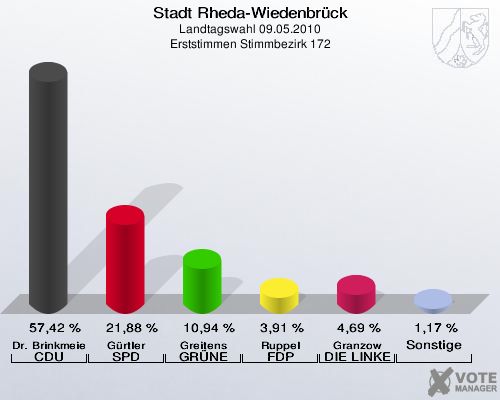 Stadt Rheda-Wiedenbrück, Landtagswahl 09.05.2010, Erststimmen Stimmbezirk 172: Dr. Brinkmeier CDU: 57,42 %. Gürtler SPD: 21,88 %. Greitens GRÜNE: 10,94 %. Ruppel FDP: 3,91 %. Granzow DIE LINKE: 4,69 %. Sonstige: 1,17 %. http://www.votemanager.de