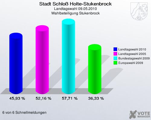 Stadt Schloß Holte-Stukenbrock, Landtagswahl 09.05.2010, Wahlbeteiligung Stukenbrock: Landtagswahl 2010: 45,93 %. Landtagswahl 2005: 52,16 %. Bundestagswahl 2009: 57,71 %. Europawahl 2009: 36,33 %. 6 von 6 Schnellmeldungen http://www.votemanager.de
